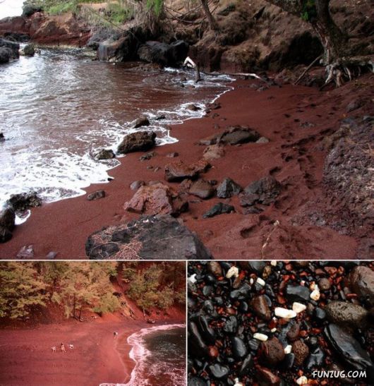 You won't find many beaches elsewhere in the world with sand as red as this one. Kaihalulu, or Red Sand Beach, is situated on the island of Maui and can thank the neighbouring cindercone hill for its intensely deep red appearance.